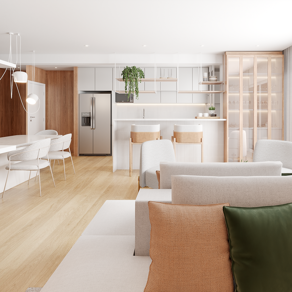 Além de 3 momentos de estar diferentes, integramos a cozinha à tudo isso! Um living integrado leve e aconchegante!